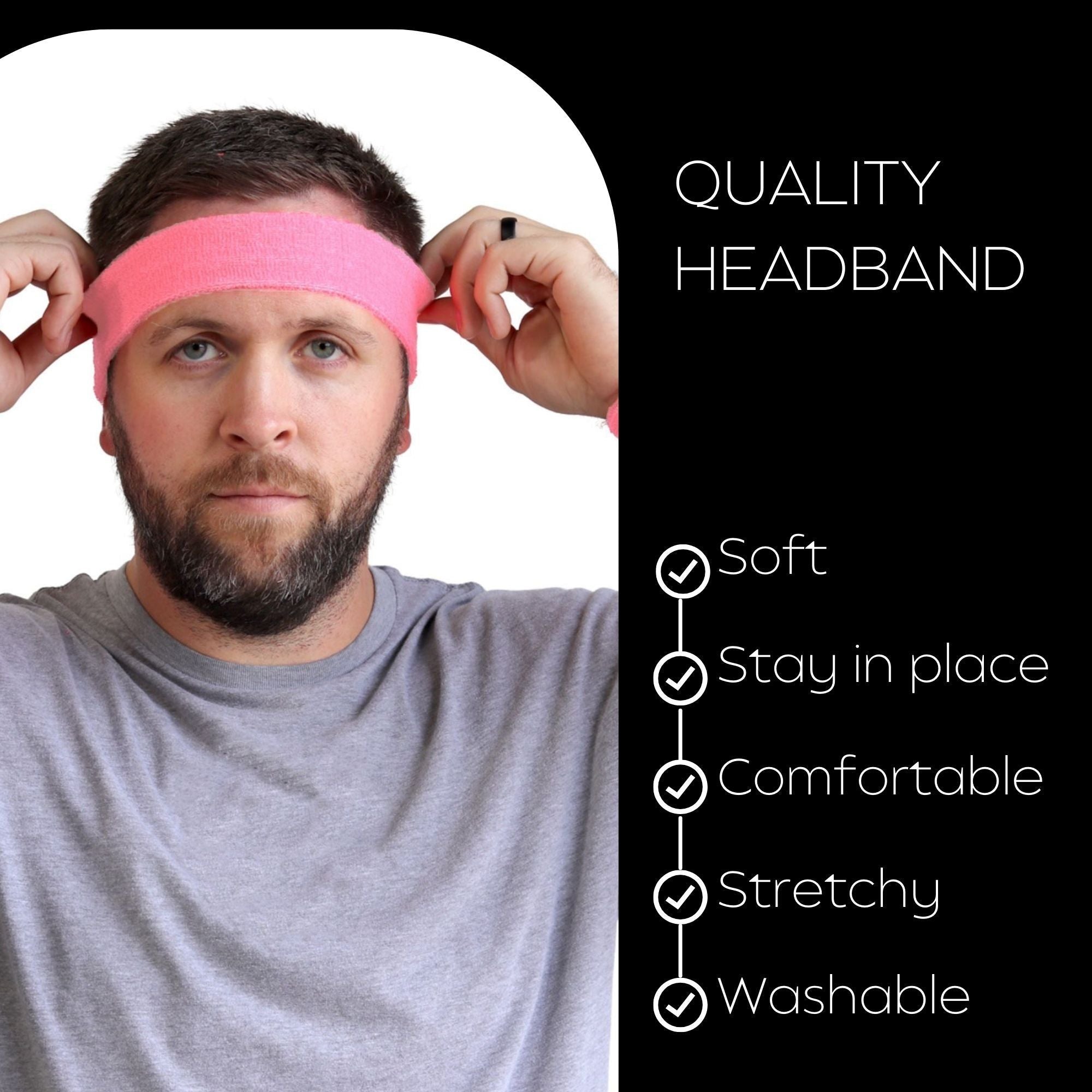 - COMFORTABLE: Our Sweatband Headbands are 6 x 2 inches and are made up of 70% Polyester Cotton/12% Spandex/18% Latex. The comfortable, soft, and stretchy fabric will keep you warm in the winter and cool in the summer. These sport headbands will stop the sweat from running down your forehead and into your eyes, so you can focus and finish strong! Grab yourself the best sweat absorbing headband and you will want one in every color.